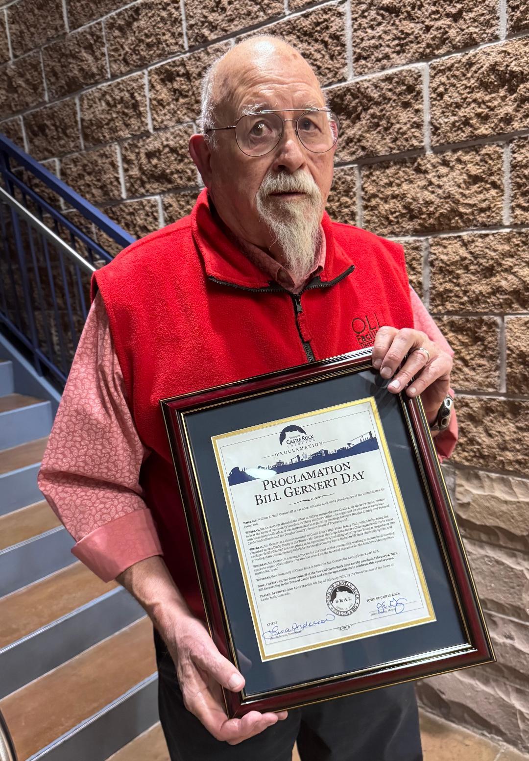 CASTLE ROCK HIGH NOON member Bill Gernert was celebratedfor his achievement in the Town of Castle Rock and beyond with February 4, 2025 designated as “Bill Gernert Day”. Many of Bill’s projects stem from his work with the Rotary club including his support of the Afghan refugee family the Club has adopted, his work in getting sets of ViewMasters with historic images of the Town to the Museum and Chamber, his work for decades with Ducky Derby and his many other examples of “Service Above Self!”