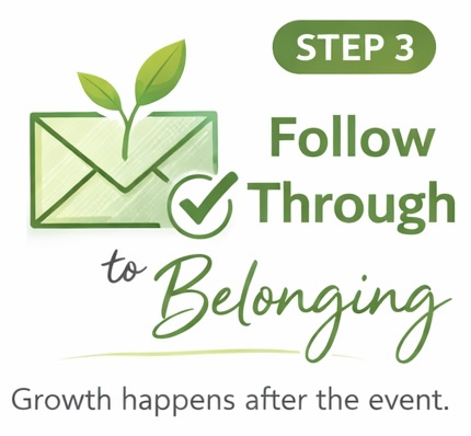 Once your event begins, the focus shifts from logistics to people. Step 2 is about turning attendance into a meaningful connection. Welcome guests personally, start conversations that invite them to share their story, and create space for participation rather than presentation. Capture contact information clearly and simply, and communicate one clear next step before they leave. Growth does not happen because someone signs in. It happens because someone feels seen, valued, and invited to belong.