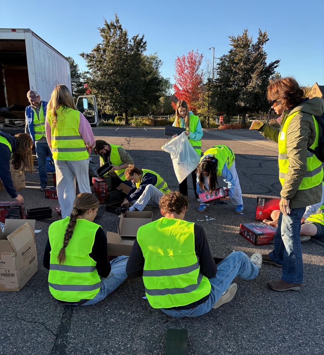 The Gun Safe Giveaway took place on October 18 in Boulder Community Health Foothills Hospital parking lot. Registration was not required, and distribution was based on first-come, first-served while supplies lasted, with a limit of two items per household. There was such a high demand that the supply was depleted with 75 people left in line. Twenty-five Boulder Rotary Club members, 15 members of the Fairview High School Interact Club and many community members made the event happen. Photo: Fairview Interact Students loading batteries into safes.